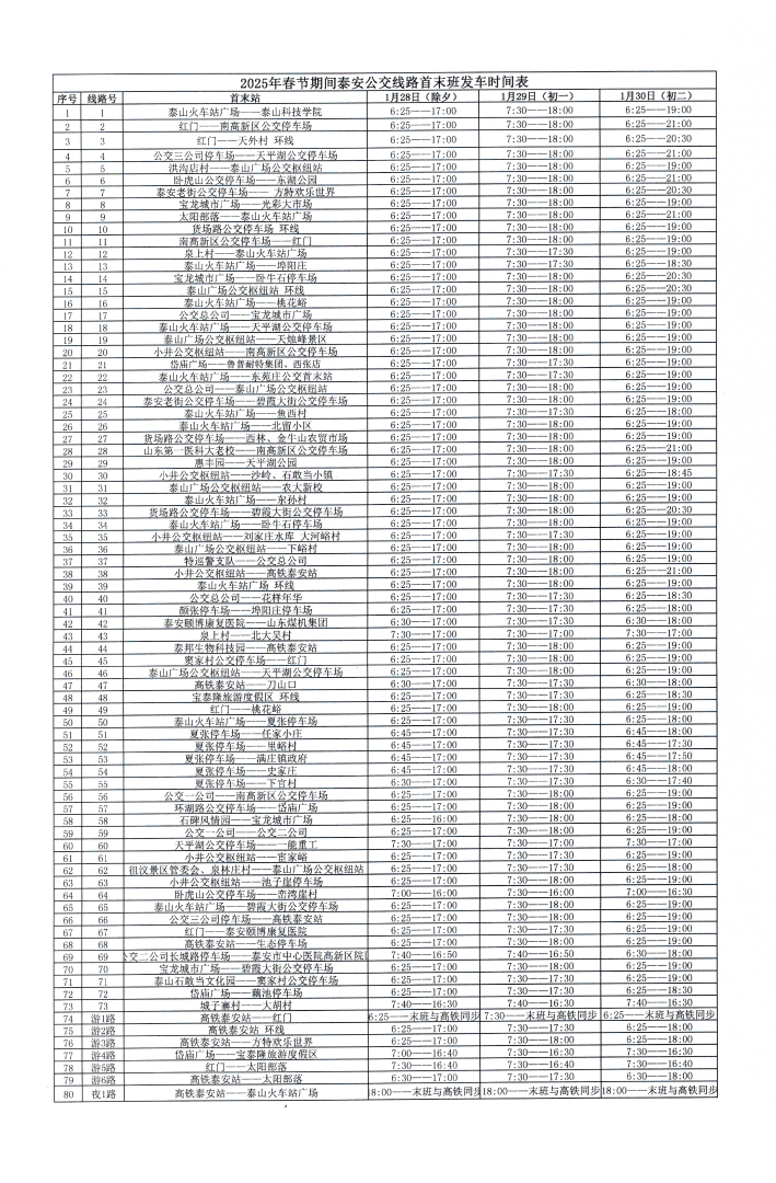 為切實保障好春節(jié)期間市民出行,泰安市公共交通有限公司結(jié)合市民節(jié)日出行規(guī)律和變化,統(tǒng)籌考慮安排公交線路首末班發(fā)車時間,1月28日、29日(除夕、初一)將對所屬營運線路發(fā)車間隔、首末班時間等作出調(diào)整(具體情況見附表)。